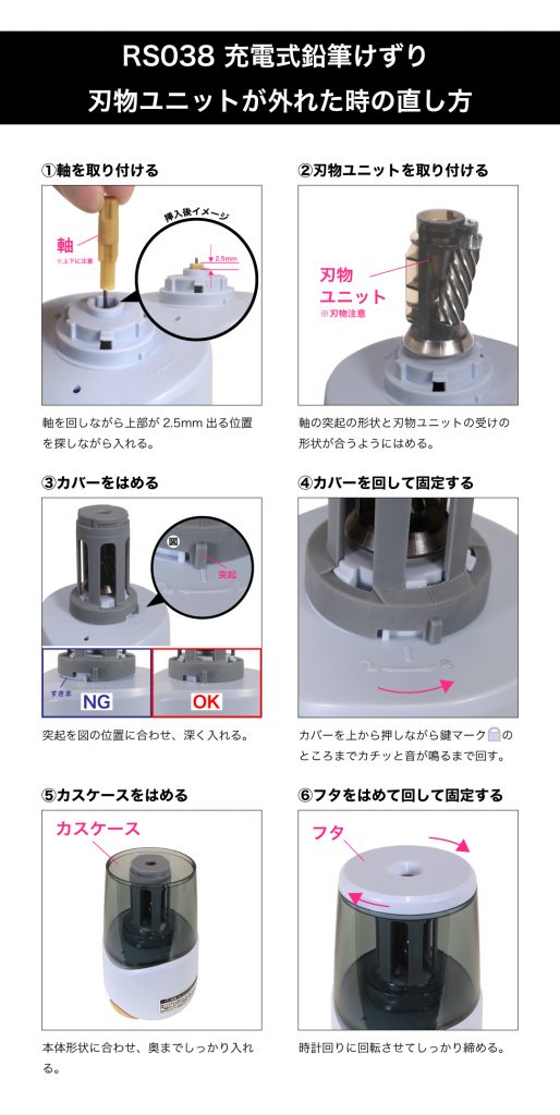 充電式鉛筆けずり(RS038)刃物ユニットが外れた時の直し方が分からない。