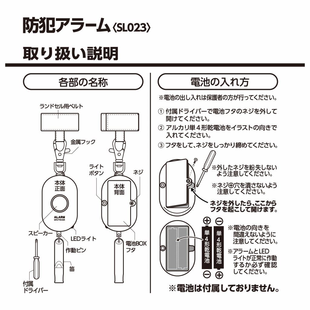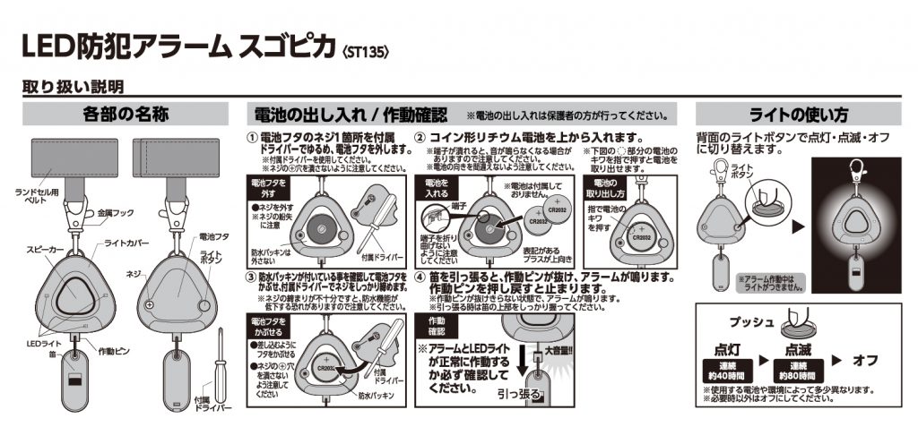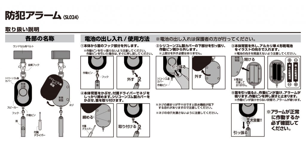 防犯アラームの使い方が分からない。説明書をなくした。