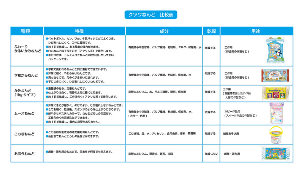 弊社で扱っている粘土には、かみねんど、こむぎこねんど、あぶらねんどなどがあります。