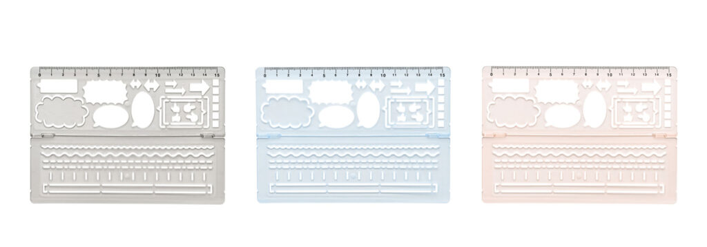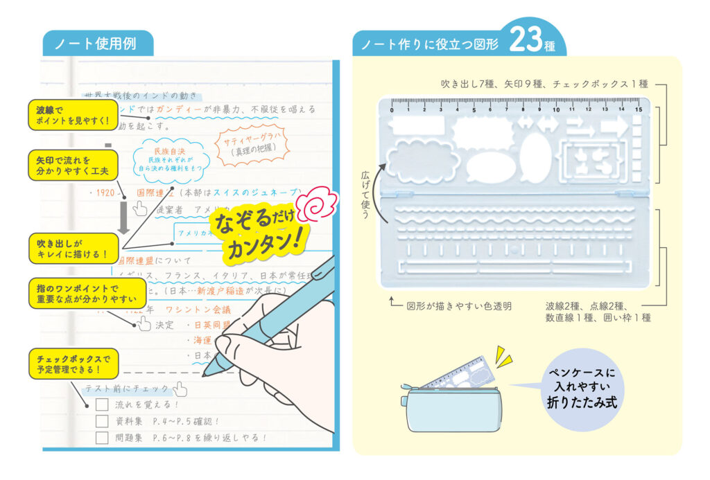 “情報量が増える中高生の効率的なノート作りをサポート”がコンセプト。「見やすいノートが作れるテンプレート」は、吹き出しや矢印、数直線といったノート作りに役立つ23種類の豊富な図形を用意。「波線も引ける直定規」は重要な部分に引く波線を簡単に引くことができます。全国の文具店・量販店・オンラインショップなどで販売しています。