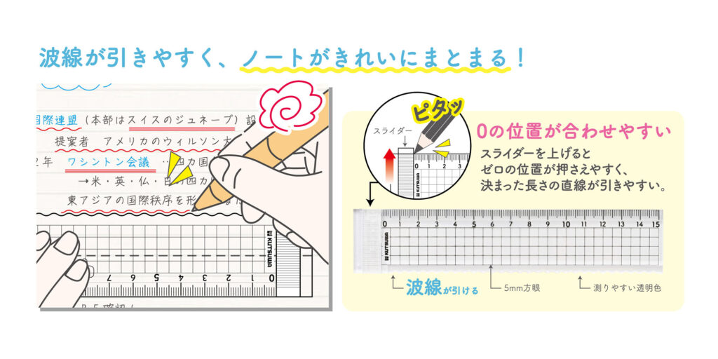 「波線も引ける直定規」は、定規の片側が波型になっており、きれいに引くのが意外と難しい波線を簡単に引くことができます。重要点は波線、見出し線や図表を引くときは直線など、1本で使い分けができるので効率的にノートをまとめられます。また、左端にあるスライダーを上げるとゼロの位置がピタッと決まるので、決まった長さの線を引く時に便利です。