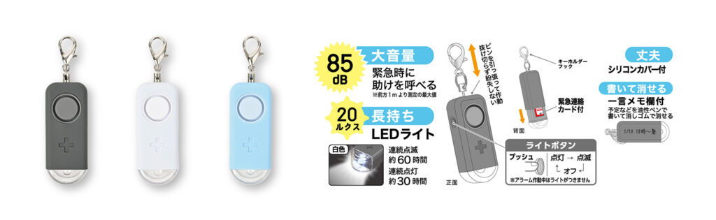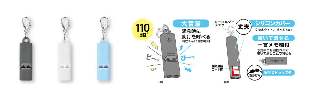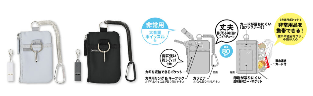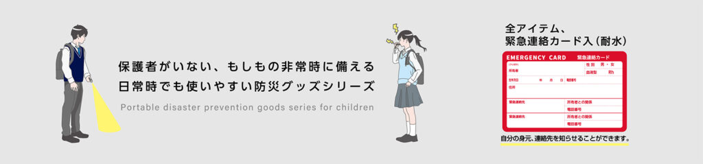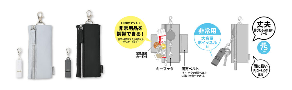 防犯対策はもちろんのこと、近年は地震や台風などの防災への意識が大変高まっています。防災用品を常備するご家庭は多いと思いますが、通学等の外出時における万が一への備えはいかがでしょうか。そのような問題意識から、お子様の外出時における安心・安全をサポートすることを目指して「モシモノ」シリーズを企画しました。キーホルダーにできるホイッスルやライト、通学に欠かせないパスケースやキーケース、超小型の携帯ブザーなど、“いつもの生活に溶け込むアイテム”であるのに、いざという時に役に立つアイテムでシリーズを構成。すべてのアイテムに耐水性の「緊急連絡カード」が付属しています。