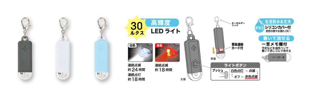 足元まで明るく照らす高輝度のコンパクトLEDライト。点灯、点滅、さらに非常灯として役立つ赤点滅の3段階に光り方を調節できます。付属のキーホルダーフックでランドセルやバッグに取り付けられるので、下校中など普段から交通安全に役立ちます。
