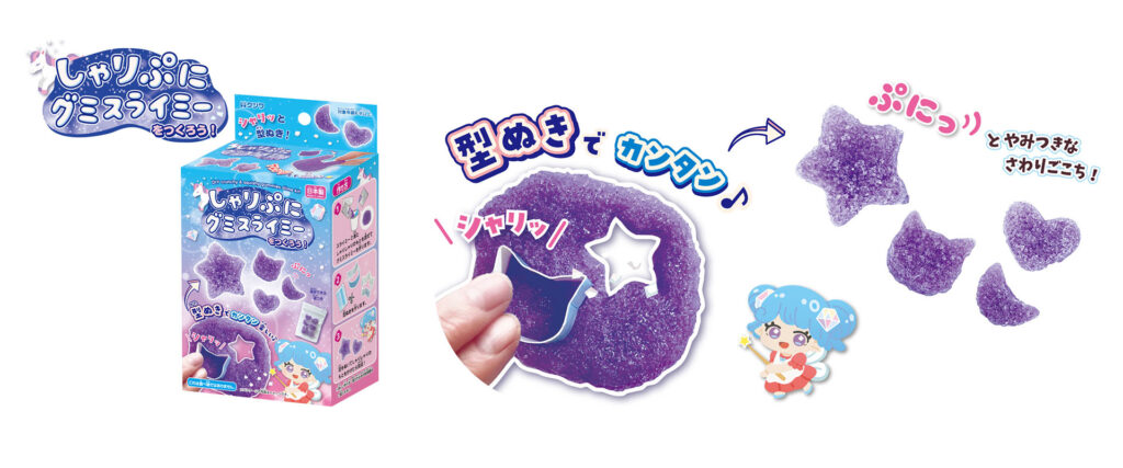 “しゃりっ”と“ぷにっ”が同時に楽しめる、不思議な触感のスライムです。スライムを作ったらハートやネコの型で抜いてかわいくアレンジ。抜く時に「しゃりっ」とした音と感覚を楽しめます。「しゃりしゃりのもと」をまぶせば、まるでシュガーコーティングされた本物のグミのようなビジュアルに。作品を保存できるジップ袋付き。