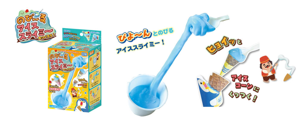 びよ~んとのびるトルコアイスのようなスライムです。スプーンにぐるぐる巻きつけてのばして遊んだり、アイスコーンに盛り付けてヒョイっと持ち上げて楽しめます。フルーツなどをトッピングしてアイスクリームショップ気分でデコレーションできます。作品を保存できるカップ付。