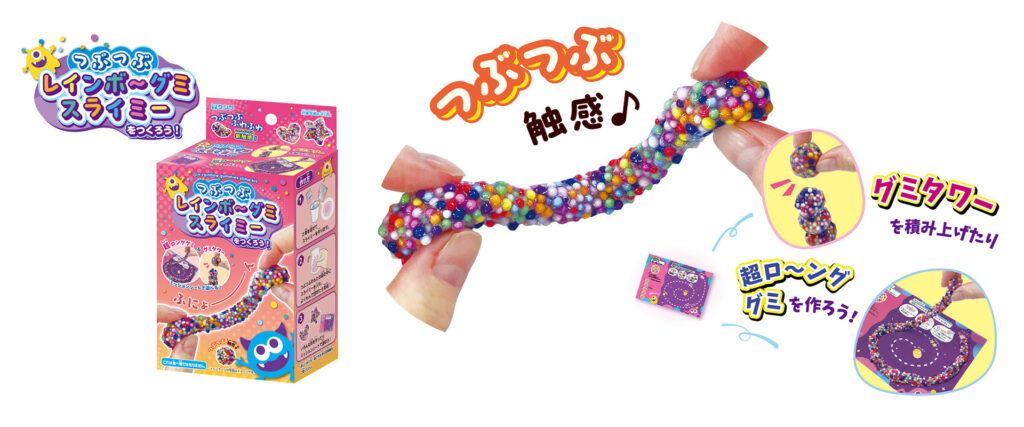 ラインアップは、カラフルでポップなビジュアルとつぶつぶ触感が楽しい「つぶつぶレインボーグミスライミー」、しゃりしゃりの表面とグミのようなぷにぷに触感がおもしろい「しゃりぷにグミスライミー」、びよーんとのびるトルコアイス屋さんごっこができる「のびーるアイススライミー」の全3種。思わず触りたくなる不思議な感覚を楽しく体験できます。全国の文具店・量販店・オンラインショップなどで販売しています。